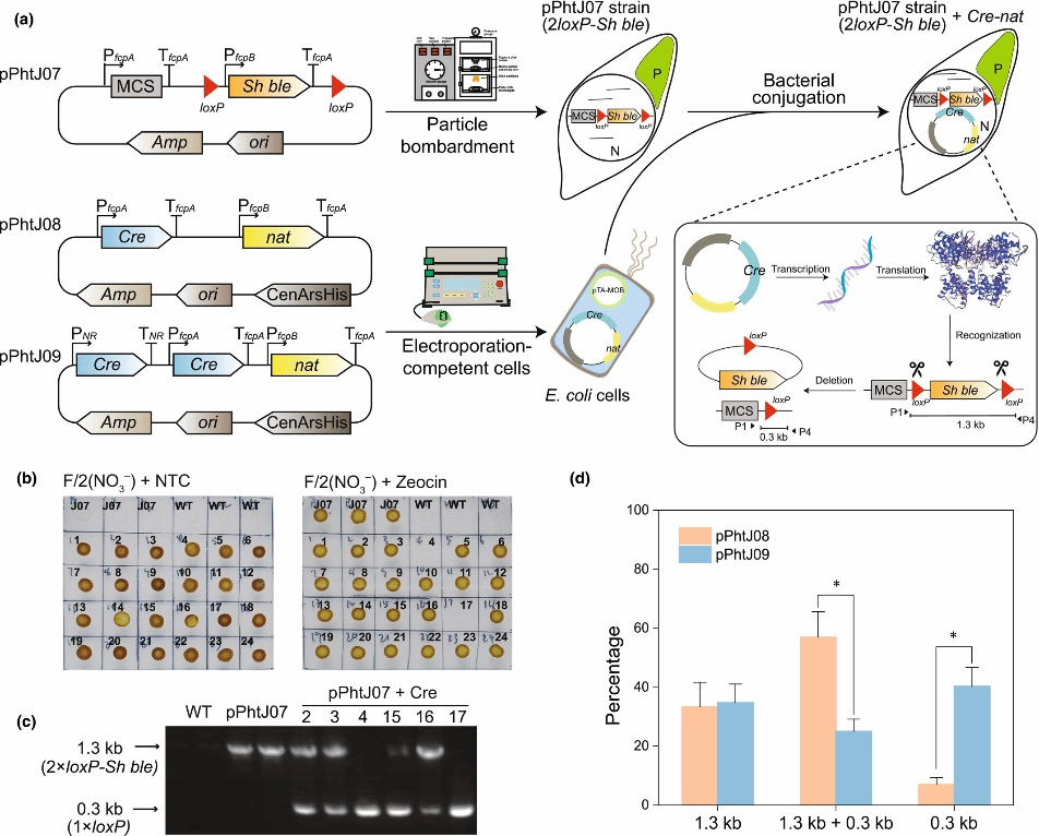 三角褐指藻富含多不饱和脂肪酸、色素和抗氧化剂等天然成分,在制药、化妆品及食品工业中具有广泛应用潜力。然而对于三角褐指藻的开发仍存在缺乏精准的同源重组整合工具、有限的筛选标记种类以及缺乏高效的遗传标记回收系统等问题。为解决三角褐指藻遗传改造中存在的筛选标记匮乏的问题,本研究首先在三角褐指藻中建立源自噬菌体P1的 Cre/loxP 重组系统。Cre重组酶可识别特异的loxP序列,并有效切除两个loxP位点之间的选择标记。研究中在首先通过在Cre序列中插入来源于三角褐指藻内源基因nr(Phatr3_J54983)、40S-S4(Phatr3_J18559)和Phatr3_J51169的内含子序列,避免了在原核表达中的自切除现象。进一步研究表明,cre序列插入Phatr3_J51169的内含子在藻细胞中表达转录后,可被高效剪切并翻译成完整的Cre蛋白序列。该 Cre 重组酶可有效去除在藻基因组上整合的两个同向 loxP 序列之间的筛选标记基因(图2)。