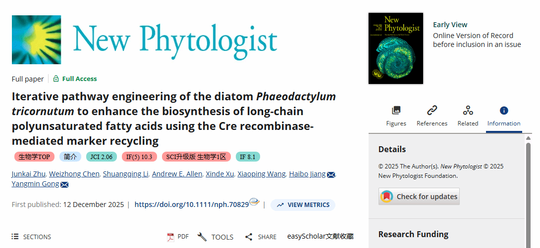 姜海波教授团队联合中国科学院水生生物研究所龚阳敏副研究员团队,针对真核微藻合成生物学研究中普遍存在遗传筛选标记匮乏及标记残留问题开展研究,以模式产油硅藻——三角褐指藻为底盘细胞开发了无痕筛选标记回收及迭代整合系统。研究成果以“Iterative pathway engineering of the diatom Phaeodactylum tricornutum to enhance the biosynthesis of long-chain polyunsaturated fatty acid using the Cre recombinase-mediated marker recycling”为题在植物学领域权威期刊《New Phytologist》上在线发表(图1)。